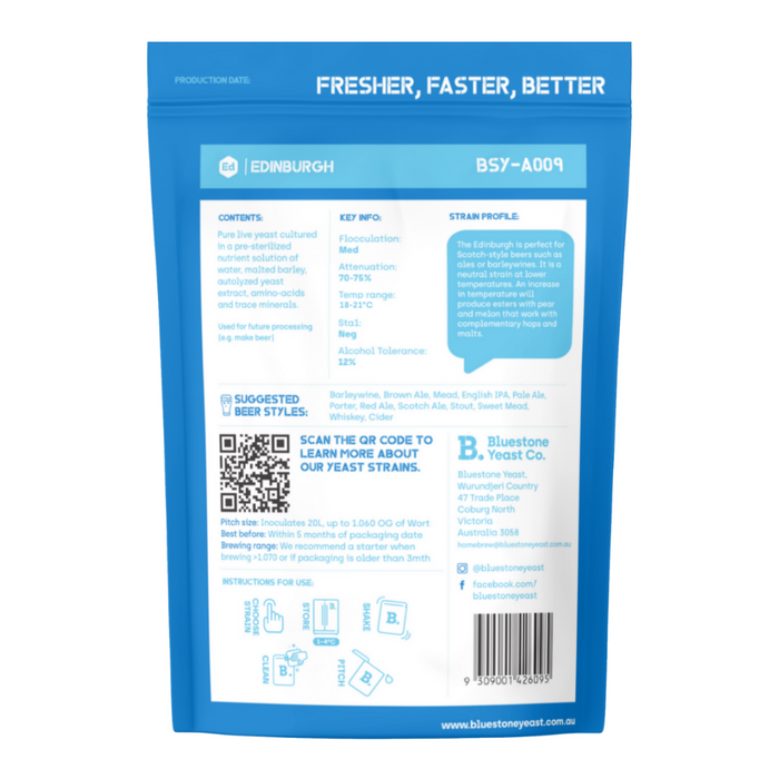 The Edinburgh strain is perfect for Scotch-style beers such as ales or barleywines. It is a neutral strain at lower temperatures. An increase in temperature will produce esters with pear and melon that work with complementary hops and malts.